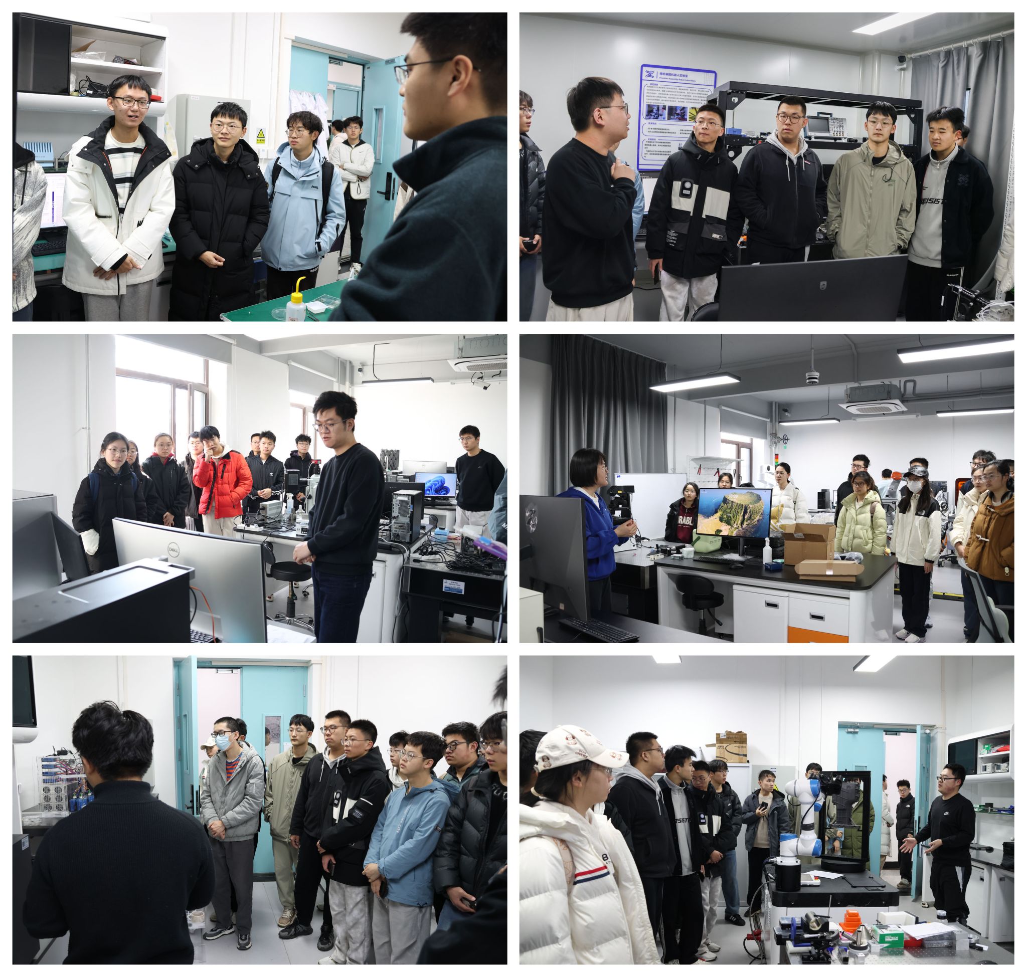 在专业老师的引导下,同学们依次走进细胞操作机器人实验室、精密装配机器人实验室、生物传感与再生医疗实验室等多个前沿实验室,近距离观察机器人的精密运作,详细了解各类实验室的研究方向与技术应用。