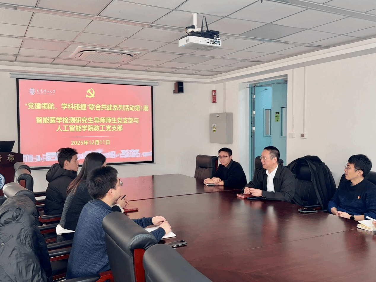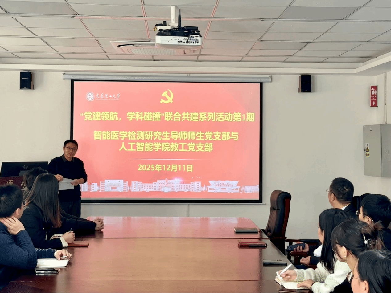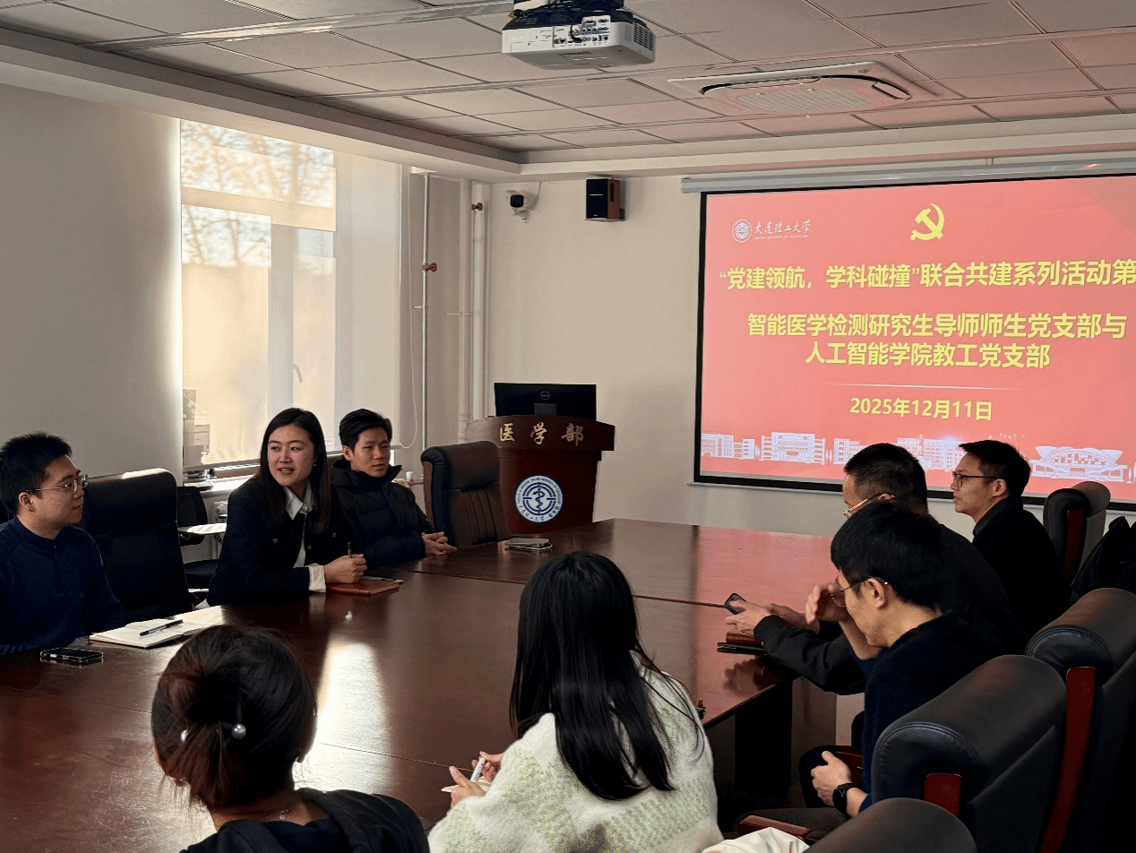 为深入贯彻落实新时代党的建设总要求,探索“党建+学科交叉”融合创新模式,建立“一融双高”特色党支部,打造“医工融合交叉共进师生先锋团队”,大连理工大学医学部智能医学检测研究生导师师生党支部计划开展“党建领航,学科碰撞”联合共建系列活动。首期于2025年12月11日与人工智能学院教工党支部联合举办。本次活动聚焦医工交叉前沿领域,邀请机器人与智能研究院两位老师走进医学部,开展了一场党建引领下的深度学术对话。
