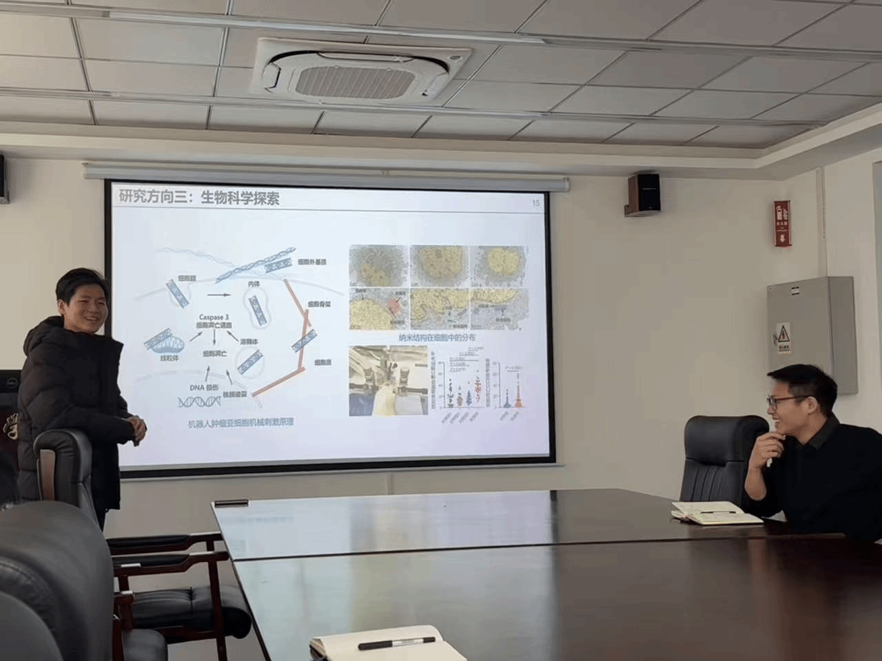 在学术交流环节,机器人与智能研究院刘俊辉教授作了题为《微纳机器人集群》的专题报告。系统介绍了微纳尺度机器人集群的构建原理、协同控制策略及其在医学造影、定域血管栓塞、生物科学探索等医学领域的创新应用,展示了该技术在未来精准医疗中的巨大潜力。