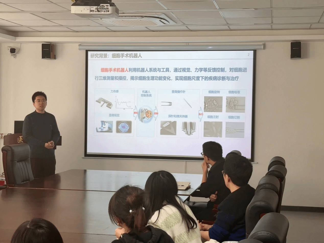 随后,单冠乔教授以《细胞手术机器人》为题,深入讲解了细胞手术机器人的关键技术突破。报告聚焦于通过机器人技术实现对单个细胞的精确操作与编辑,为细胞尺度下的诊断、非标记三维视觉感知及微创细胞手术提供了革命性的工具平台,引发了在场师生的浓厚兴趣与热烈讨论。